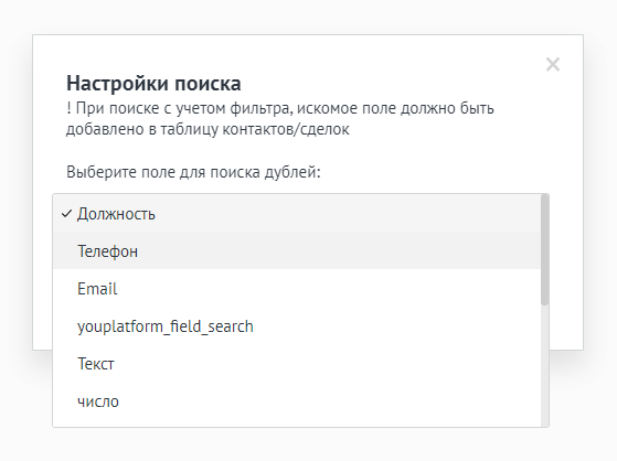 Виджет ищет дубли в областях списков контактов, компаний и сделок. Позволяет искать по телефону, почте и пользовательским полям следующих типов: